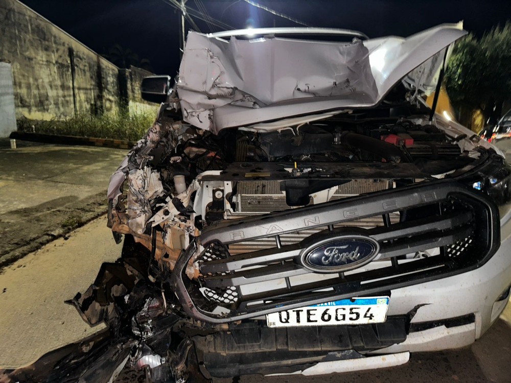 Uma colisão impressionante na noite deste domingo (22) deixou a parte frontal de uma caminhonete em Jaru completamente destruída. O acidente ocorreu quando uma Ford Ranger, dirigida por uma mulher, colidiu violentamente na traseira de um caminhão boiadeiro que estava estacionado na Rua Beira Rio.