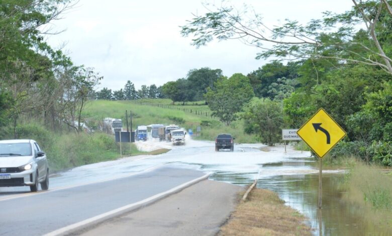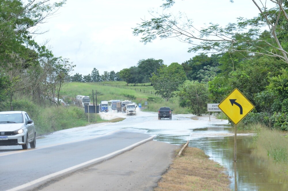 Com a pista parcialmente tomada pela água, muitos motoristas estão se arriscando na travessia, enfrentando pontos onde o nível chega a cerca de um metro de altura. Essa condição tem provocado lentidão e congestionamento nos dois sentidos da rodovia, dificultando o tráfego e aumentando o tempo de deslocamento.