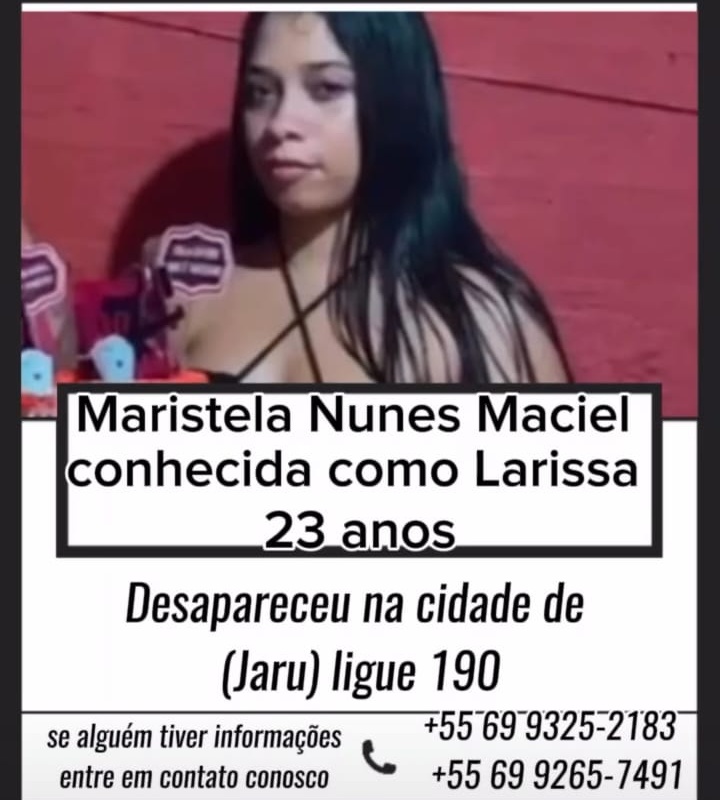 Larissa não possui familiares na região e nunca havia ficado tanto tempo sem se comunicar. Amigos e conhecidos estão mobilizando esforços para encontrá-la e pedem a ajuda da população. Qualquer informação que possa ajudar na localização da jovem deve ser encaminhada à Polícia Militar pelo telefone 190 ou pelos números (69) 99325-2183 e (69) 99265-7491.