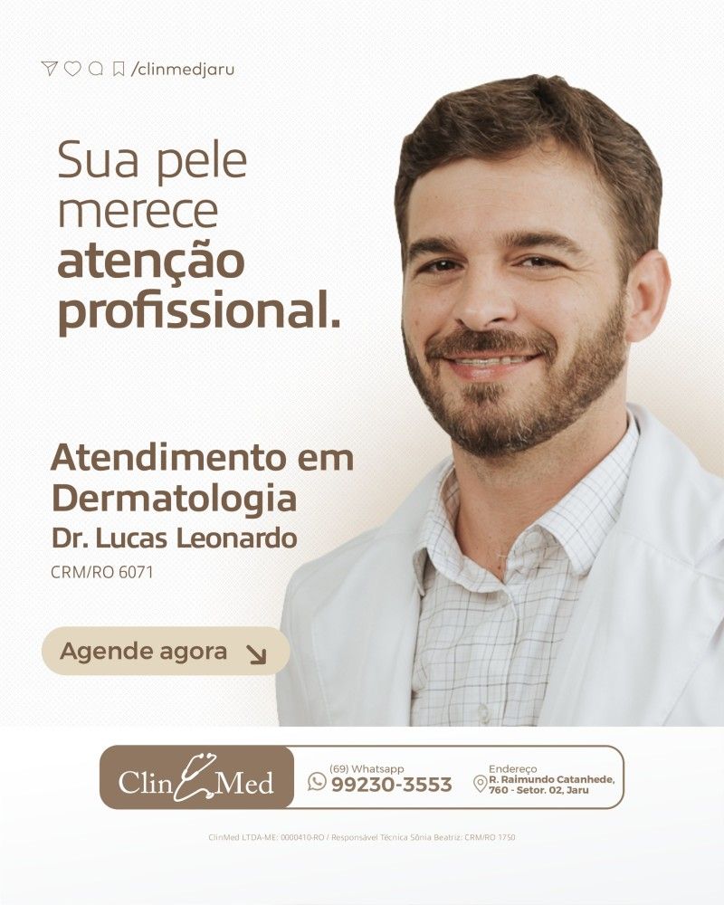 Nesta terça e quinta-feira, a Clin Med em Jaru receberá o renomado dermatologista Dr. Lucas Leonardo, oferecendo atendimento especializado para a população da região. Este é um momento oportuno para quem busca cuidados com a pele, desde consultas de rotina até procedimentos mais específicos.