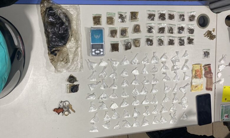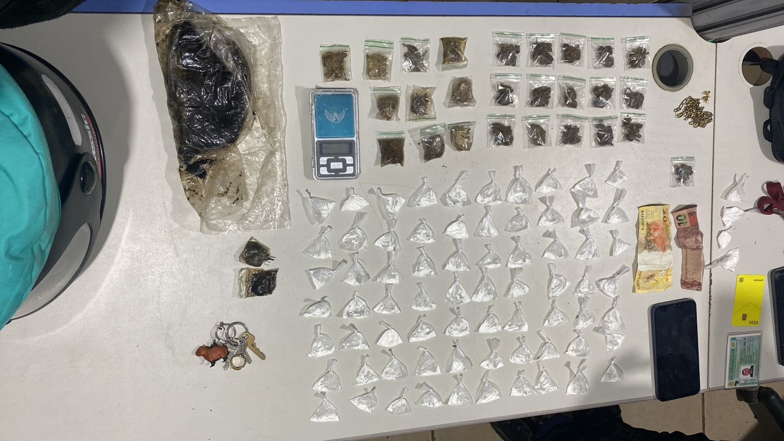 Próximo à motocicleta de R.J.S.A., foram encontradas porções de uma substância que aparentava ser cocaína. Além disso, dentro de uma bolsa que estava com ele, foram localizadas mais uma porção da droga e dinheiro em espécie. Com E.I.L.B., foi encontrada uma porção semelhante à maconha.