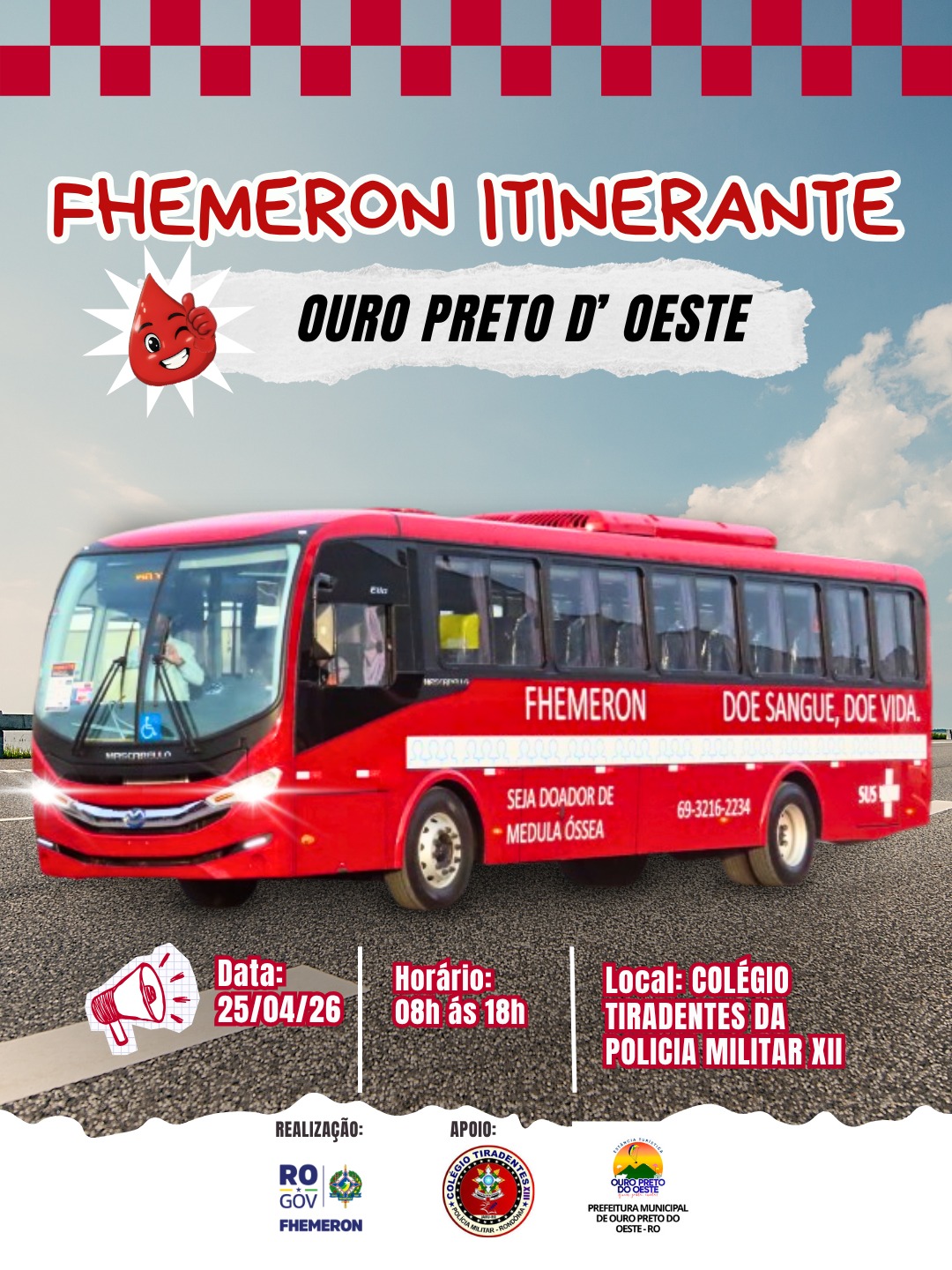 O Hemocentro de Rondônia (Fhemeron) promove, no próximo dia 25 de abril de 2026, uma coleta itinerante de sangue em Ouro Preto do Oeste. A iniciativa ocorrerá das 8h às 18h, no Colégio Tiradentes da Polícia Militar XII, com apoio de instituições locais.