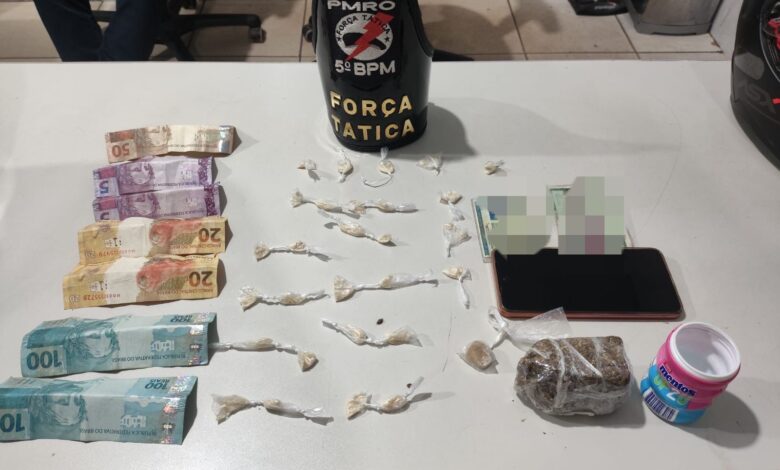 Durante a abordagem, os policiais flagraram D.V.J. tentando repassar um objeto para uma mulher que aguardava do lado de fora com dinheiro em mãos. Ao realizarem a busca no imóvel, os agentes encontraram 29 invólucros de uma substância que aparenta ser crack, além de uma porção de maconha, R$ 250,00 em dinheiro e um aparelho celular. A suspeita admitiu que vendia cada invólucro por R$ 10,00.