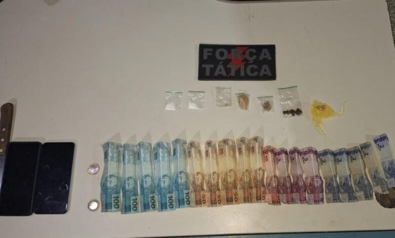 Durante a abordagem, a equipe encontrou com o preso uma quantia em dinheiro fracionado, dois celulares sem procedência e, após uma varredura nas proximidades, foram localizadas porções de substâncias que se assemelhavam a crack, cocaína e maconha. Também foi apreendido um instrumento utilizado para fracionar as drogas, tudo acondicionado de maneira típica para a venda.