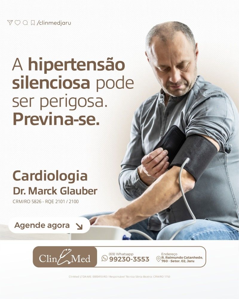 Especialistas enfatizam que o acompanhamento médico regular e a aferição frequente da pressão arterial são medidas essenciais. O cardiologista Dr. Marck Glauber, CRM/RO 5826, com RQE 2101 e 2100, oferece atendimento especializado na Clin Med, realizando avaliações completas e orientações personalizadas para o controle e tratamento das doenças do coração.