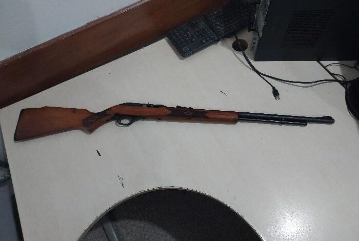 Durante a busca, os policiais localizaram um rifle calibre .22, além de munições de diversos calibres, como 9mm, .22, .38 e .380, todas sem a devida documentação. O homem revelou que tinha a arma guardada na dispensa da casa, o que facilitou a apreensão.