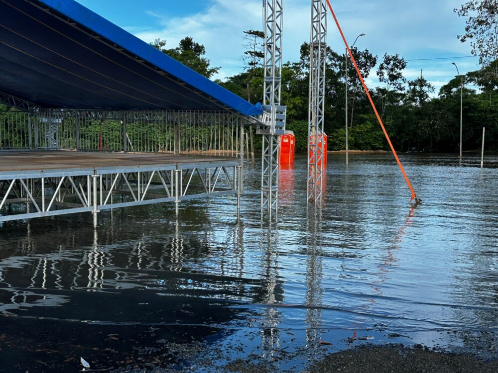 O Rio Jaru transbordou de sua calha natural, causando alagamentos no Bosque Beira Rio, local onde estão programadas as atividades do Barco Cross. No final da tarde desta quinta-feira, a água já havia invadido a área destinada aos banheiros químicos e à estrutura do palco do evento, com o nível ainda em ascensão.