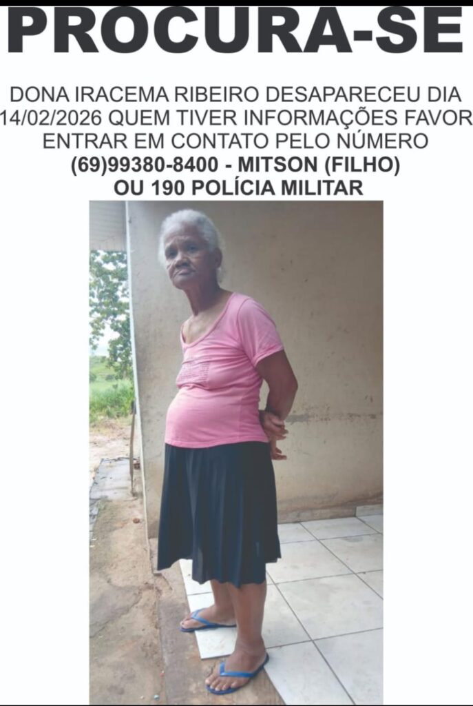 A idosa Iracema Ribeiro de Oliveira, de 84 anos, continua desaparecida após sair de sua propriedade na zona rural de Ouro Preto do Oeste no sábado, 14 de fevereiro. A propriedade fica localizada na esquina da linha 101, cerca de 4 quilômetros do 31, Portadora de Alzheimer, ela deixou a residência e não foi mais vista desde então. O caso mobiliza familiares, forças de segurança e voluntários, que seguem empenhados nas buscas.