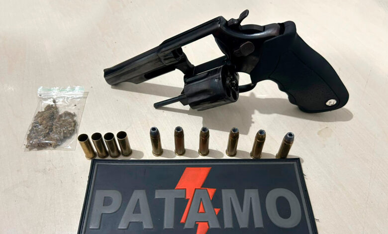 Por volta das 19h, já no bairro Urupá, o veículo foi visualizado e abordado. Durante a abordagem, foram realizadas busca pessoal nos ocupantes e vistoria veicular, seguindo os protocolos operacionais. No interior do carro, foi encontrado um revólver calibre .38 no porta-luvas, municiado com quatro munições, sendo três intactas e uma deflagrada. O condutor assumiu a propriedade da arma, afirmando não possuir registro.