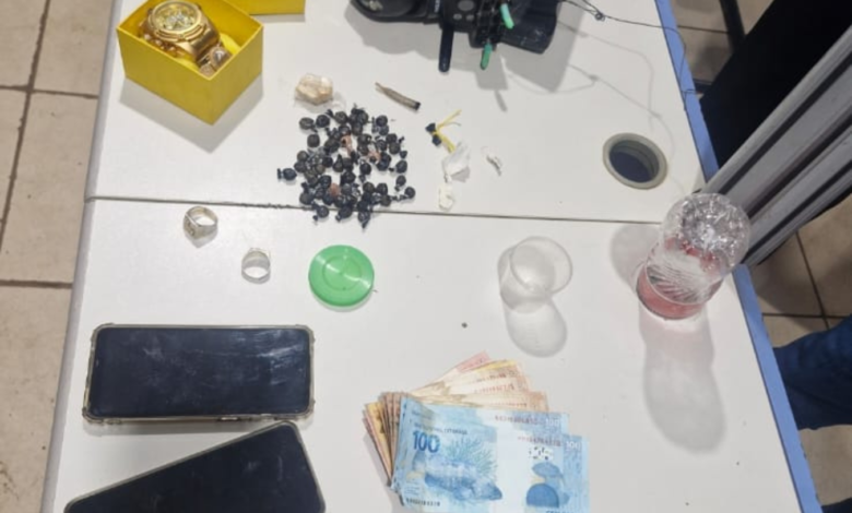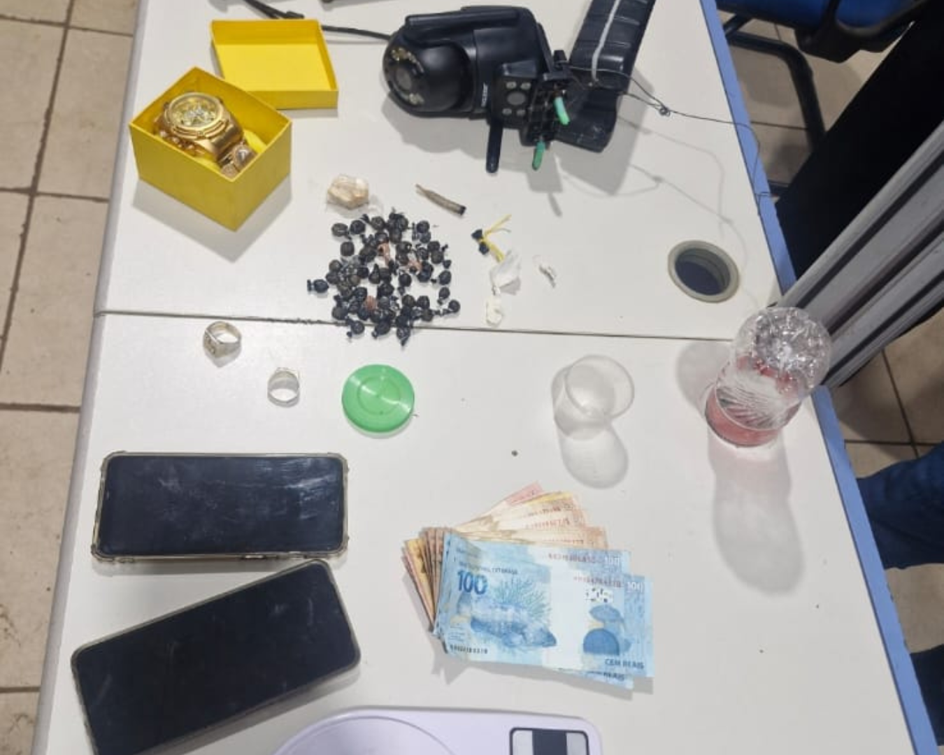 Após as abordagens, os policiais realizaram buscas na casa com a autorização do morador, onde encontraram materiais típicos do tráfico, como balança de precisão, dinheiro fracionado e itens para embalo de drogas. Um homem foi detido e levado à delegacia por suspeita de tráfico, enquanto os outros dois, que possuíam entorpecentes, foram encaminhados para as devidas providências.