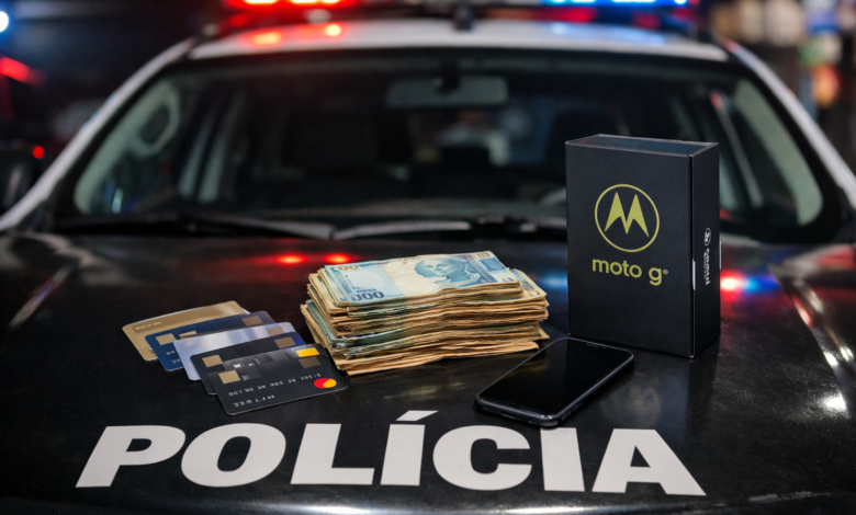 Além dos cartões, foram localizados R$ 3.775,80 em dinheiro e um celular novo, ainda na embalagem original, sem identificação que pudesse esclarecer sua origem. A situação levantou suspeitas sobre a possível apropriação de bens ilícitos, levando os policiais a agir rapidamente para evitar potenciais crimes patrimoniais na região.