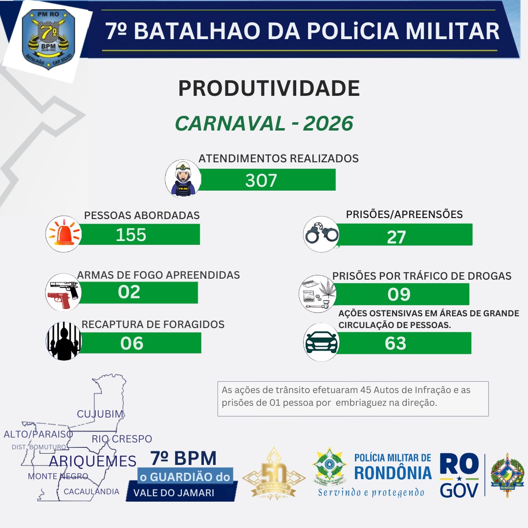 Durante o Carnaval de 2026, o 7º Batalhão da Polícia Militar intensificou suas ações de policiamento no Vale do Jamari, focando na prevenção de crimes e na segurança dos foliões. Com um total de 307 atendimentos, a polícia abordou 155 pessoas e realizou 63 operações em áreas de grande movimento, garantindo a presença constante das equipes policiais nos principais pontos de concentração.