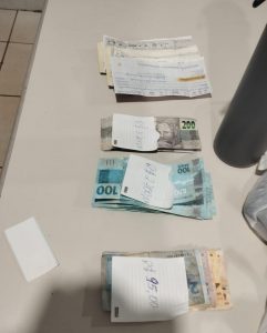 Durante a ocorrência foram apreendidos uma camionete Toyota Hilux cinza, cerca de R$ 6.195 em espécie, folhas de cheques, uma pistola Taurus calibre .380 com registro de furto em 2023, munições, carregador e um coldre de couro.