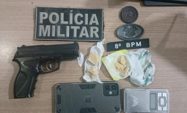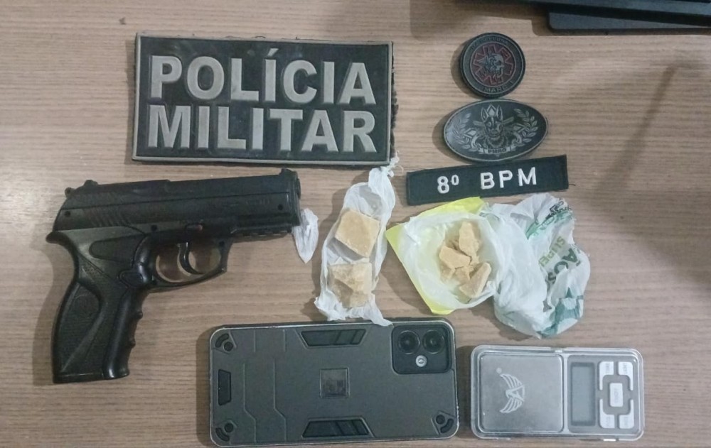 Os policiais intensificaram o patrulhamento na área e localizaram o suspeito em uma distribuidora. Ao perceber a aproximação da viatura, ele demonstrou nervosismo e tentou esconder um objeto, o que levou os militares a realizarem a abordagem. Durante a revista, foi encontrada uma balança de precisão e um aparelho celular em sua posse, além de um volume suspeito na cintura de uma mulher que o acompanhava.