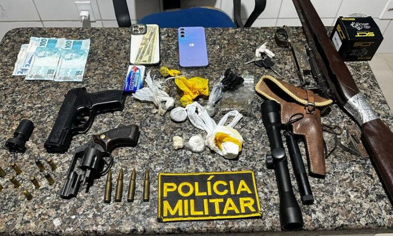 No imóvel, os policiais descobriram um revólver municiado escondido na caixa do vaso sanitário, além de munições e substâncias semelhantes à maconha. Com o auxílio de um cão farejador, a operação foi ampliada, resultando na apreensão de um fuzil calibre 7.62, porções de cocaína, maconha e crack, além de ferramentas e acessórios de armamento. Todo o material foi encaminhado à Delegacia de Polícia, onde os envolvidos permanecem à disposição da Justiça.
