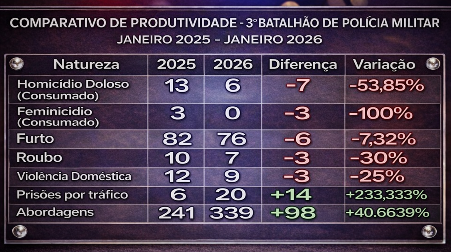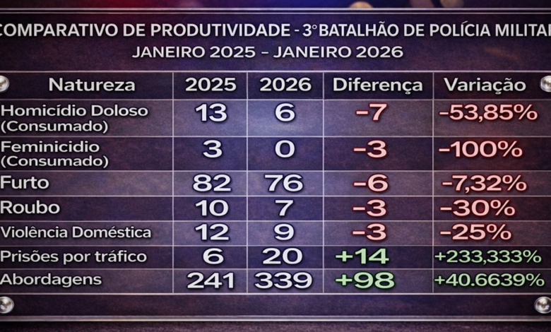 O 3º Batalhão da Polícia Militar apresentou dados comparativos entre janeiro de 2025 e janeiro de 2026, revelando uma significativa redução nos principais crimes contra a vida e o patrimônio na região. Os números indicam que os homicídios dolosos caíram de 13 para 6, o que representa uma diminuição de 53,85%. Além disso, os casos de feminicídio não foram mais registrados, resultando em uma queda de 100%. Os crimes patrimoniais, como furtos e roubos, também mostraram reduções notáveis.